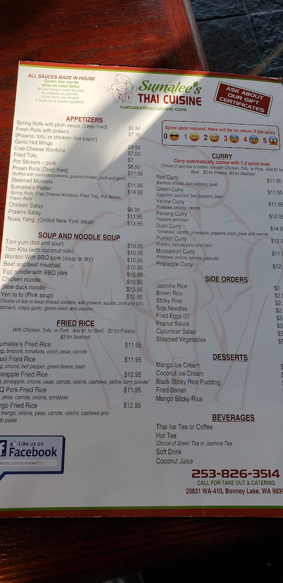Welcome to Sumalee's Thai Cuisine, a hidden gem located in Bonney Lake, WA. This delightful establishment brings authentic Thai flavors to life with a menu that offers a generous variety of dishes, ensuring there's something for everyone. Customers rave about the Basil Chicken and the popular gluten-free Chicken Pad Thai, both praised for their robust flavors and generous portions.